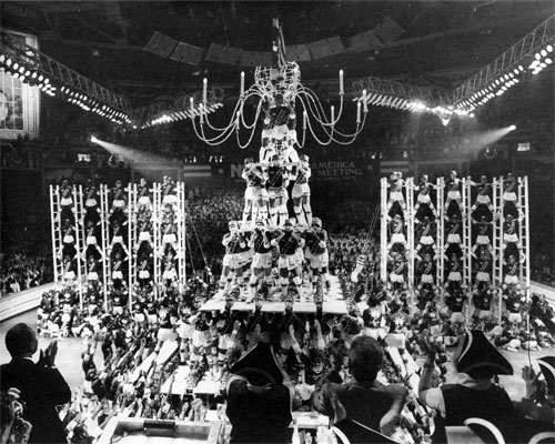Walter: On roller skates. We were on roller skates and the rest were on our shoulders. It was in the Guinness Book of World Records.